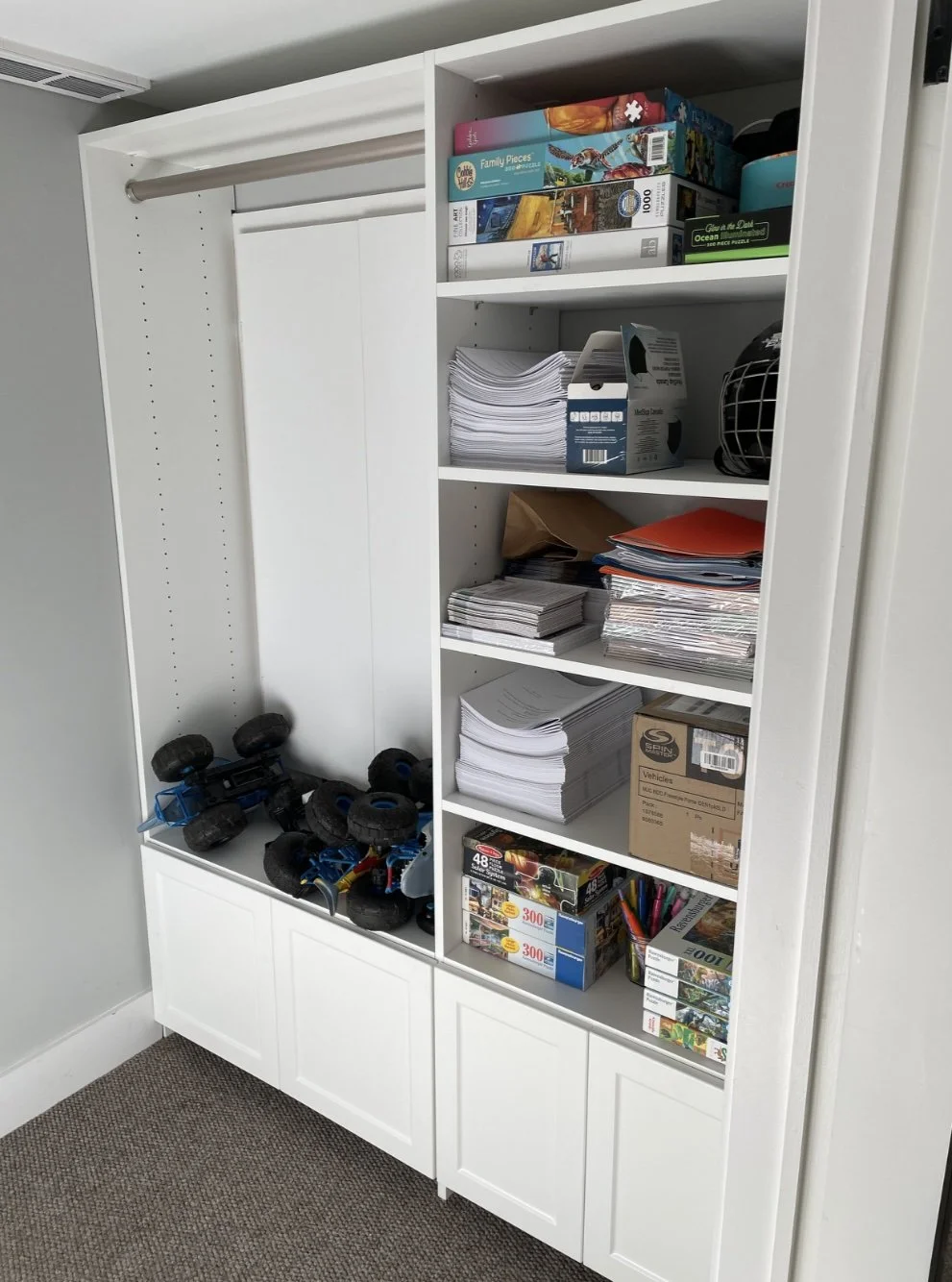 We don’t often get to see what the fruits of our labour look like after the shelves have been loaded up, but a recent customer was just too excited to wait. While we finished a second closet in their home, the first was filled with all kinds of goodies. The excitement to organize was palpable. Items that were formerly strewn around a room were neatly put away in a custom built-in we had designed and installed. It was pretty cool to see! As we into the hot months of summer, why not give yourself the gift of organization?